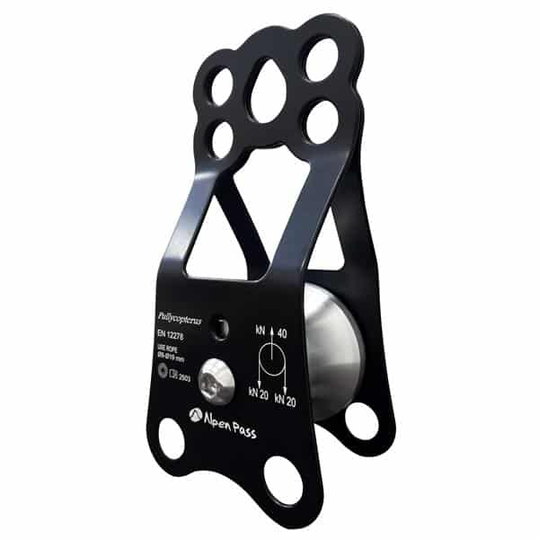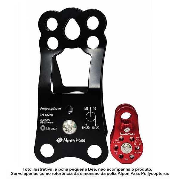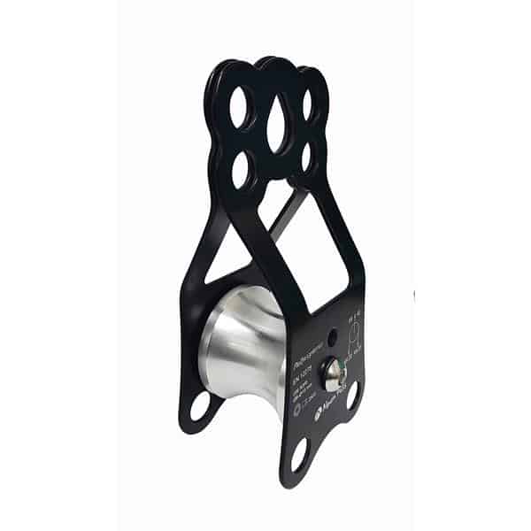 Essa polia tem um sistema de travamento do rolete para que possa ser utilizada como ponto de ancoragem.